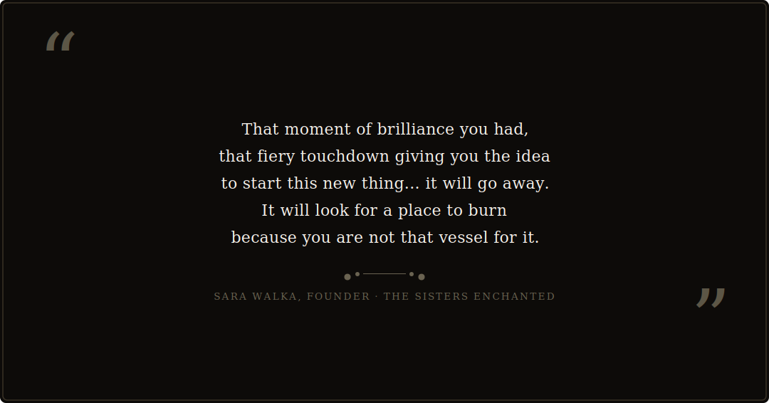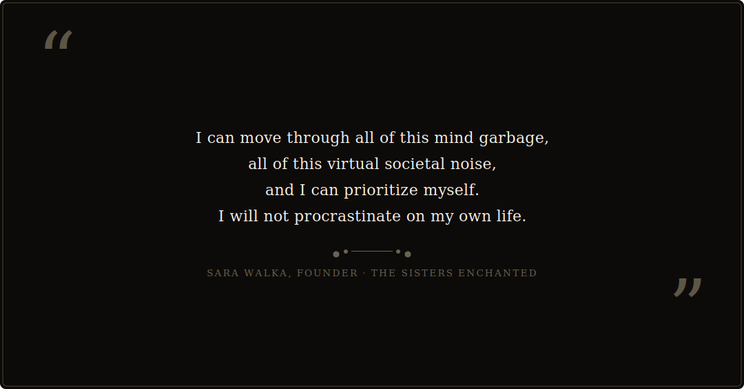 The Sisters Enchanted was founded by Sara Walka and has spent ten years helping women close the gap between their inner world and their outer lived experience. Using tools including tarot, astrology, moon phases, and the chakras, TSE’s approach positions magic as deliberate action and real work, not passive wishing or spiritual bypassing.